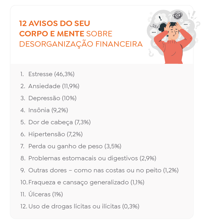 Além disso, durante essa mesma pesquisa, tais entrevistados destacaram os seguintes 12 avisos do seu corpo e mente sobre desorganização financeira em percentual: