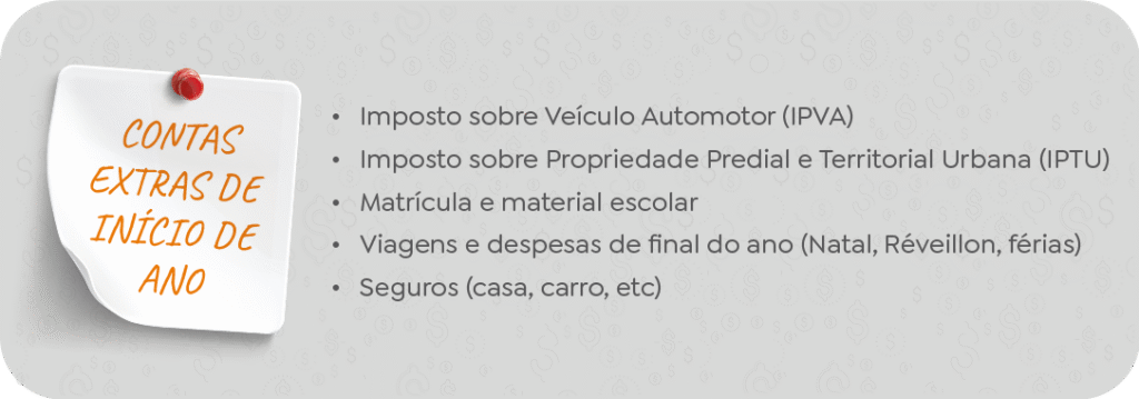 Não lembra de cabeça quais são as temidas contas de início de ano, tirando as habituais, como aluguel, luz, água, transporte, etc? A gente te ajuda com o lembrete abaixo: