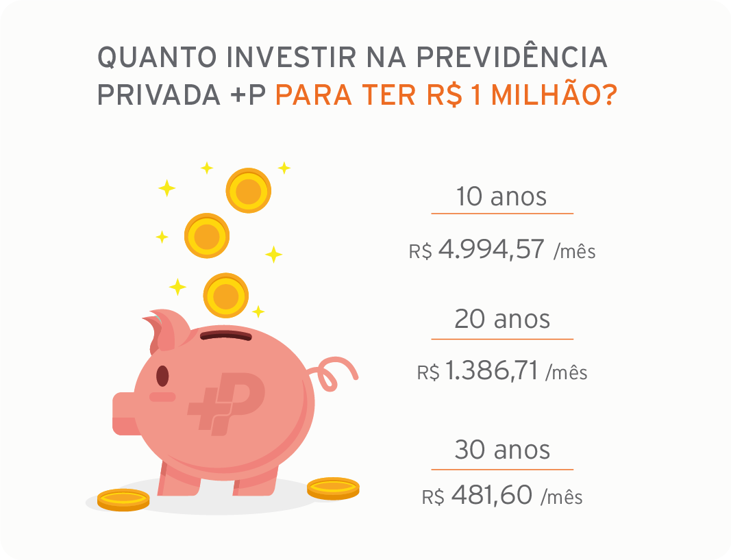 Por isso, hoje, trazemos para você uma simulação do quanto precisa investir por mês na sua previdência privada junto a +P, por exemplo, para chegar nos seus sonhados R$ 1 milhão, combinado?
